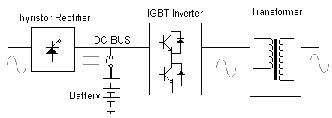 早期大中型UPS主回路結(jié)構(gòu)采用可控硅整流將輸入的交流電整為直流,電池直接掛在直流母線(xiàn)上,當(dāng)輸入市電正常時(shí),靠整流可控硅的調(diào)節(jié)對(duì)電池充電,同時(shí)為GTR或IGBT結(jié)構(gòu)的橋式逆變器供電,逆變器將直流逆變?yōu)榻涣,最后?jīng)過(guò)輸出變壓器的升壓及濾波,提供純正的交流輸出。從其結(jié)構(gòu)中可以看出,從整流(從交流變?yōu)橹绷鳎┑侥孀儯ㄔ趶闹绷髯優(yōu)榻涣鳎┑倪^(guò)程中,每個(gè)環(huán)節(jié)都是將壓環(huán)節(jié):可控硅整流是為了提供恒定的直流電壓而采取的一種整流方式(可通過(guò)可控整流的導(dǎo)通角調(diào)整來(lái)適應(yīng)輸入電壓變化,確保輸入交流電壓變化時(shí)整流輸出直流電壓的恒定),由于可控硅整流只能斬掉一部分輸入電,所以其恒定輸出電壓的代價(jià)是將輸出電壓恒定在底于全波整流輸出電壓的某個(gè)數(shù)值上。而逆變環(huán)節(jié)同樣是一個(gè)降壓環(huán)節(jié),從可控整流輸入來(lái)的直流電在通過(guò)逆變器逆變出交流的過(guò)程中同樣采用的是斬波的做法,其結(jié)果同樣是輸出電壓等級(jí)的再次降低。正是由于上述的原因,在此種結(jié)構(gòu)的UPS中,必須在輸出測(cè)加入升壓變壓器,將逆變輸出的較低恒定電壓升致合理的輸出范圍,最終提供了恒定的220/380V輸出。