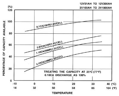 溫度對(duì)電池容量有顯著的影響,溫度降低,電池容量下降,請(qǐng)參考曲線(xiàn)圖。 |